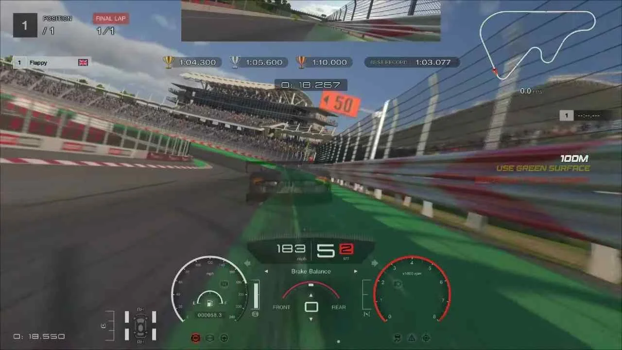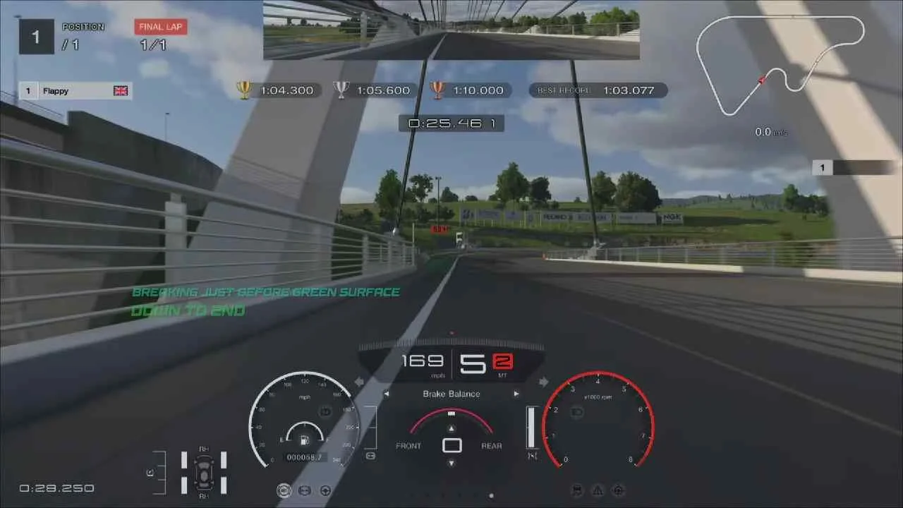 After Turn Two, you’ll pass the white line marking the end of the first sector and come across the bridge. Gradually bring the car over to the left side of the circuit, using all of the space available. As Turn Three and Turn Four are so close together, it’s essential to use Turn Three to make sure you get the best possible entry into Turn Four, prioritising this over the Turn Three exit. Just before the green surface (see image), start braking, shifting down into second gear.