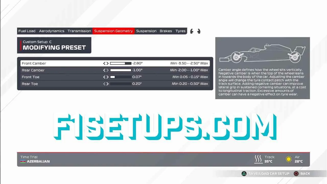 Geometry adjustments mainly impact grip and tire wear, however on F1 2021 most circuits suit the same settings! Stick with high front camber, and low everything else in this section for best results.