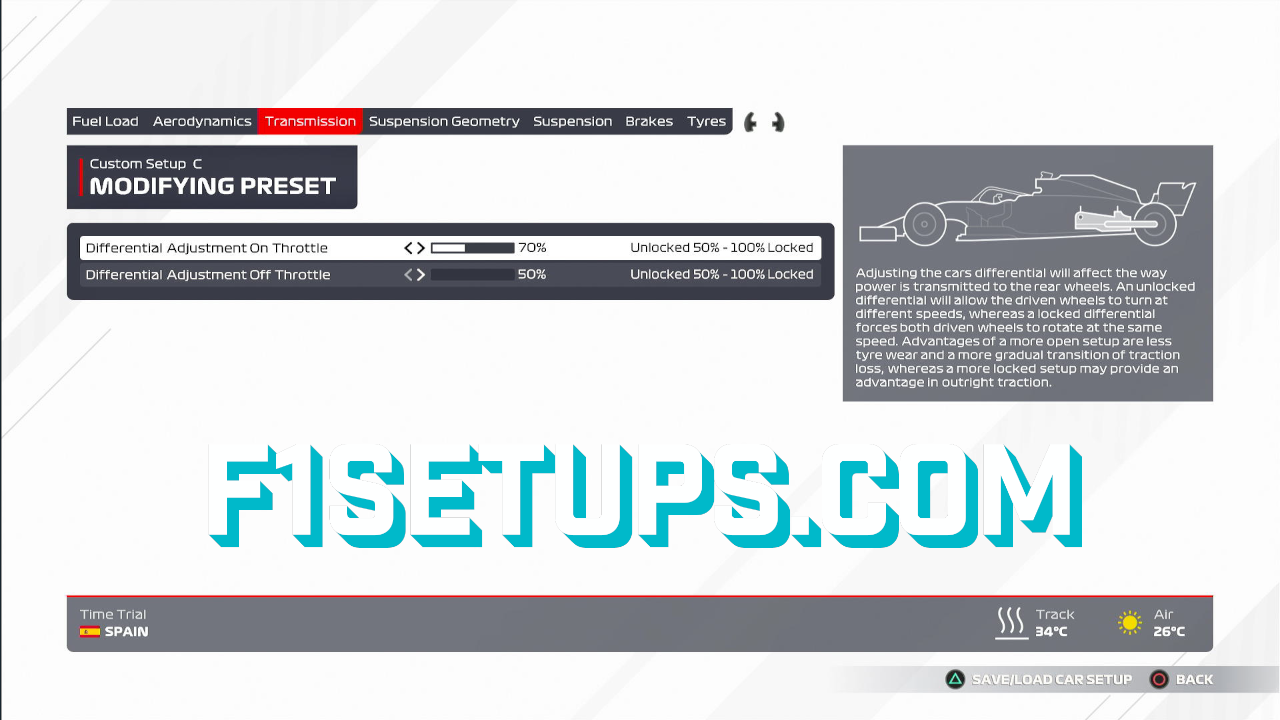 Transmission is a critical area of the setup for traction, affecting acceleration, grip, rotation, tyre wear, and drivability. Increasing the On Throttle Differential will make the car more stable on acceleration, however, will increase tyre wear. Here in Spain we will use 70%/55%. This will aid rotation in lower speed corners and should help protect the tyres from excessive wear. Increasing rear diff will improve straight-line acceleration and stability on corner exits, however, will come with a slight cost on wear.