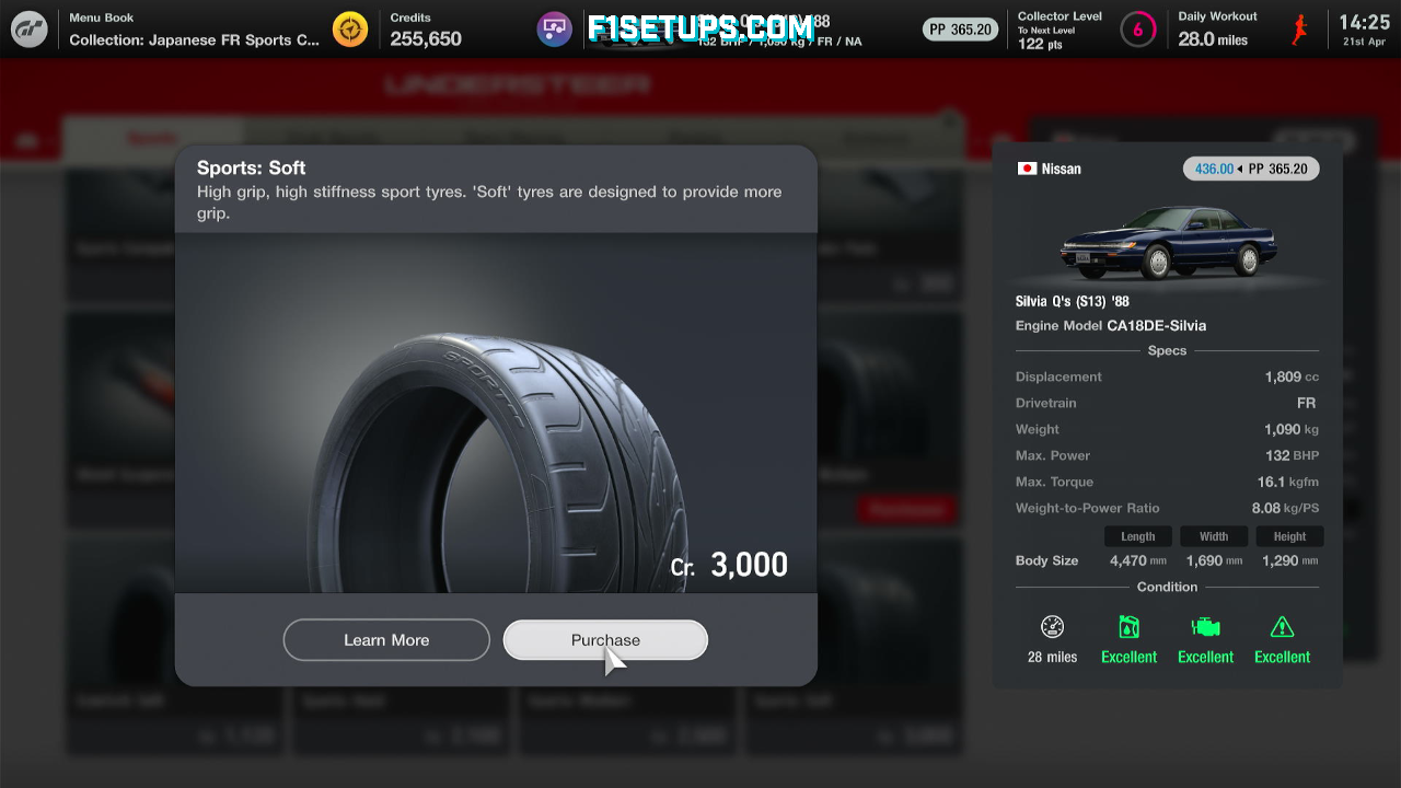 Once you’ve done this, and switched to your FR car, head to the Tuning Shop. It is possible to win these events without any modifications, however, we aren’t going to spend much and it will make life considerably easier if you do. In the Tuning Shop, buy a set of Sports Soft tyres for 3,000 credits, and that’s all you need. The PP of our Nissan Silvia is now 436, easily enough to cruise through the events we need to. Tsukuba Circuit, and enter the Japanese FR Challenge 450.
