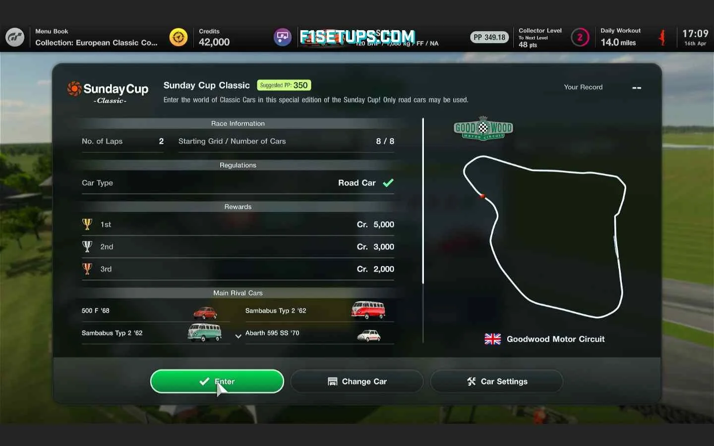 Next up, we have the Sunday Cup Classic, at Goodwood. This race will earn us the Mini Cooper ‘S’ ‘65, and takes place at Goodwood Motor Circuit. Again, we are going in the Toyota, but take the Honda if you’d prefer.